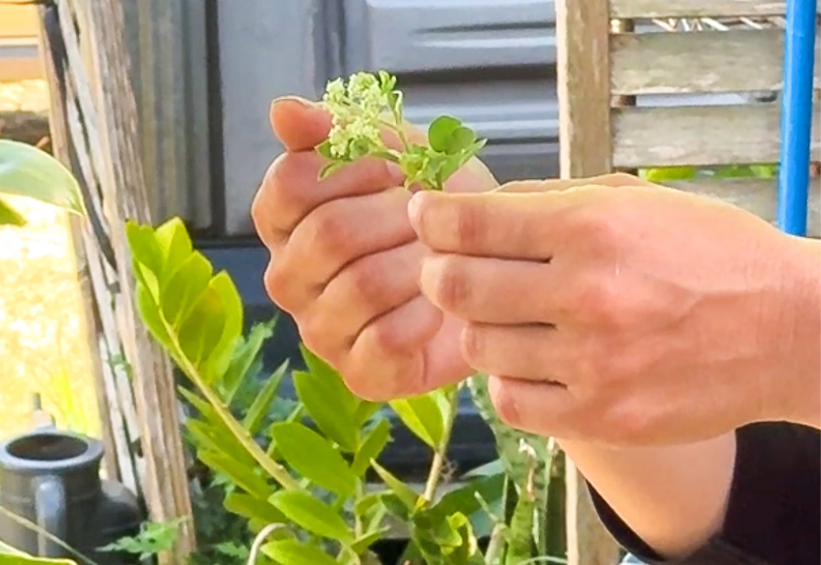 諏訪さんが手にしているのは、長命草(ボタンボウフウ/サクナ)の花です。