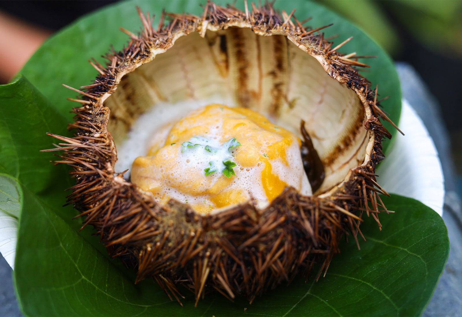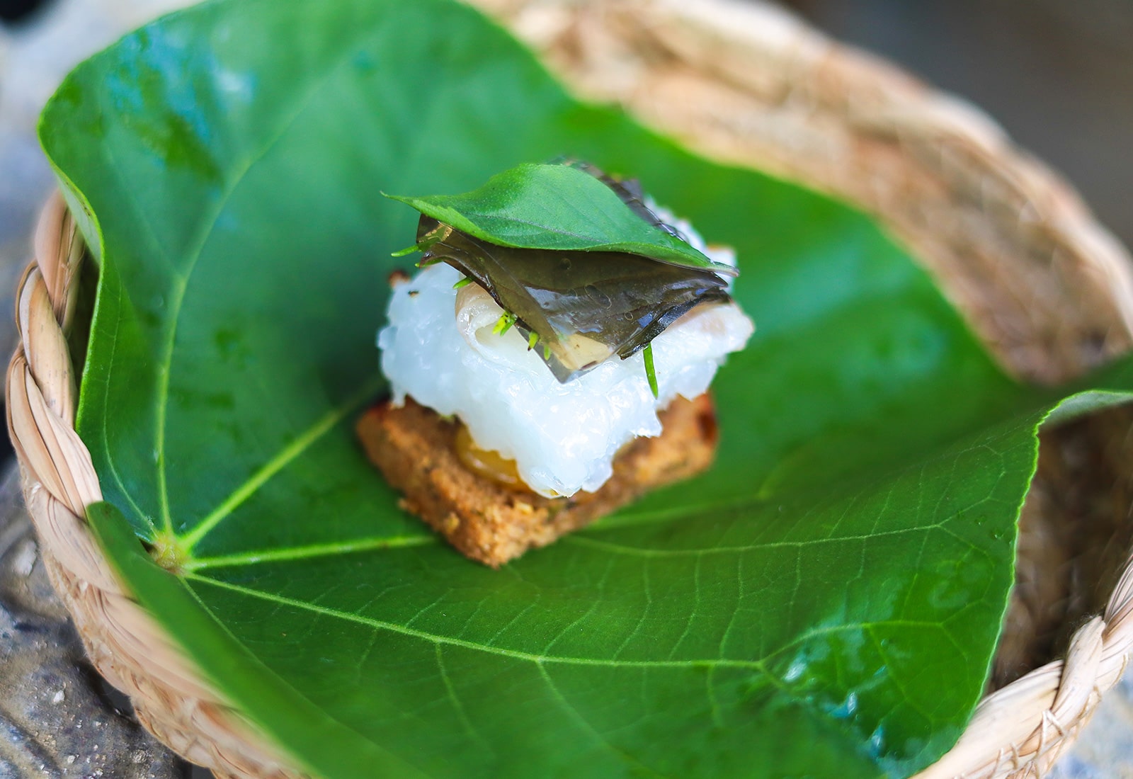 沖縄県内で養殖されている白髭雲丹の濃厚な旨味と、下に忍ばせた県産もずくのシャキシャキっとした食感。ミルクの泡にはライムリーフと琉球ヒレ山椒の香りがふわり。トッピングにはゼラニウムの花をあしらい、見た目も華やか。島南瓜のピューレは、ハーブティーで仕上げたまろやかな甘みで、雲丹のコクを引き立てます。