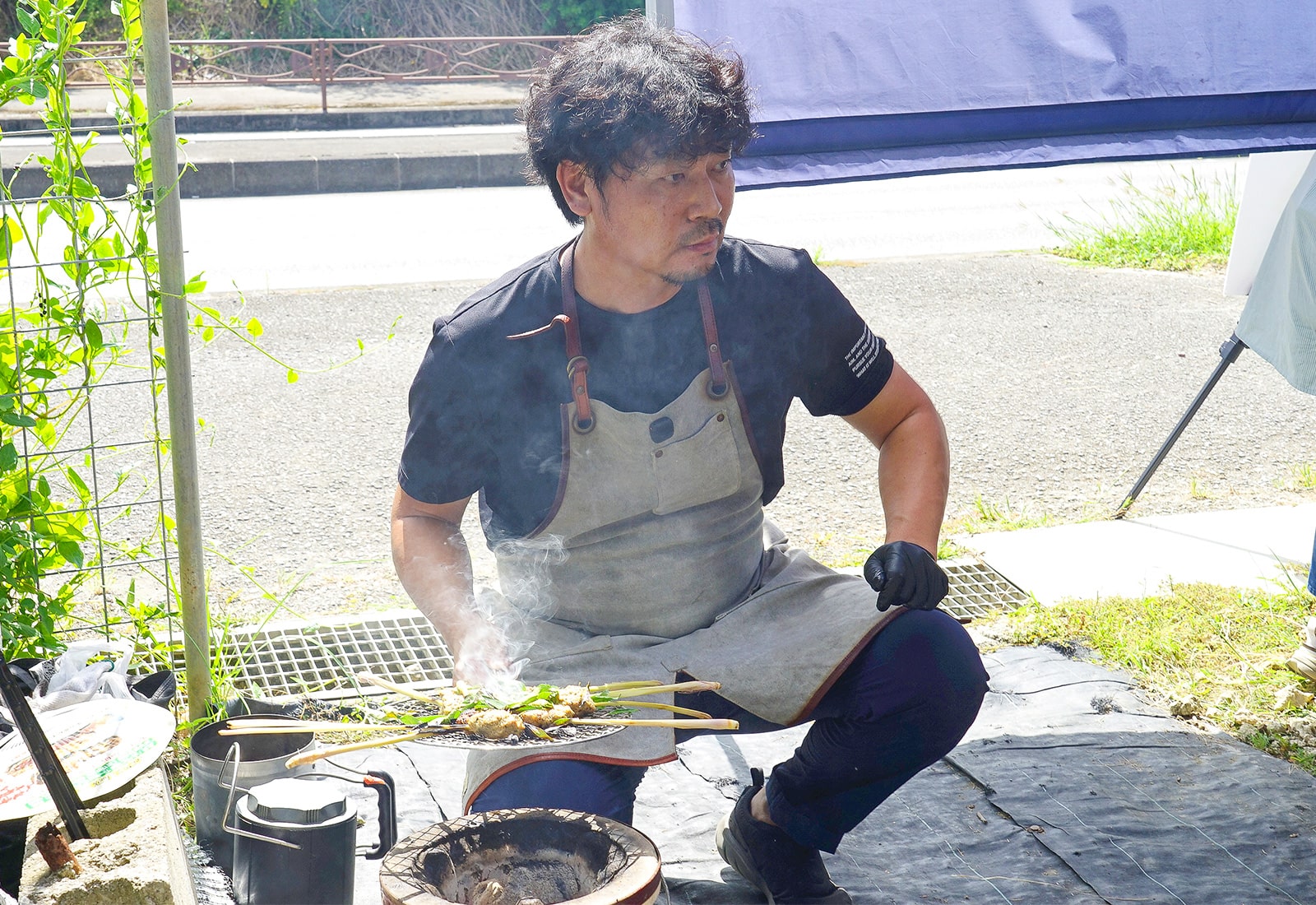 七輪の中は、炭とレモングラスとカレーリーフ。角谷氏が手に持っているのはつくね。