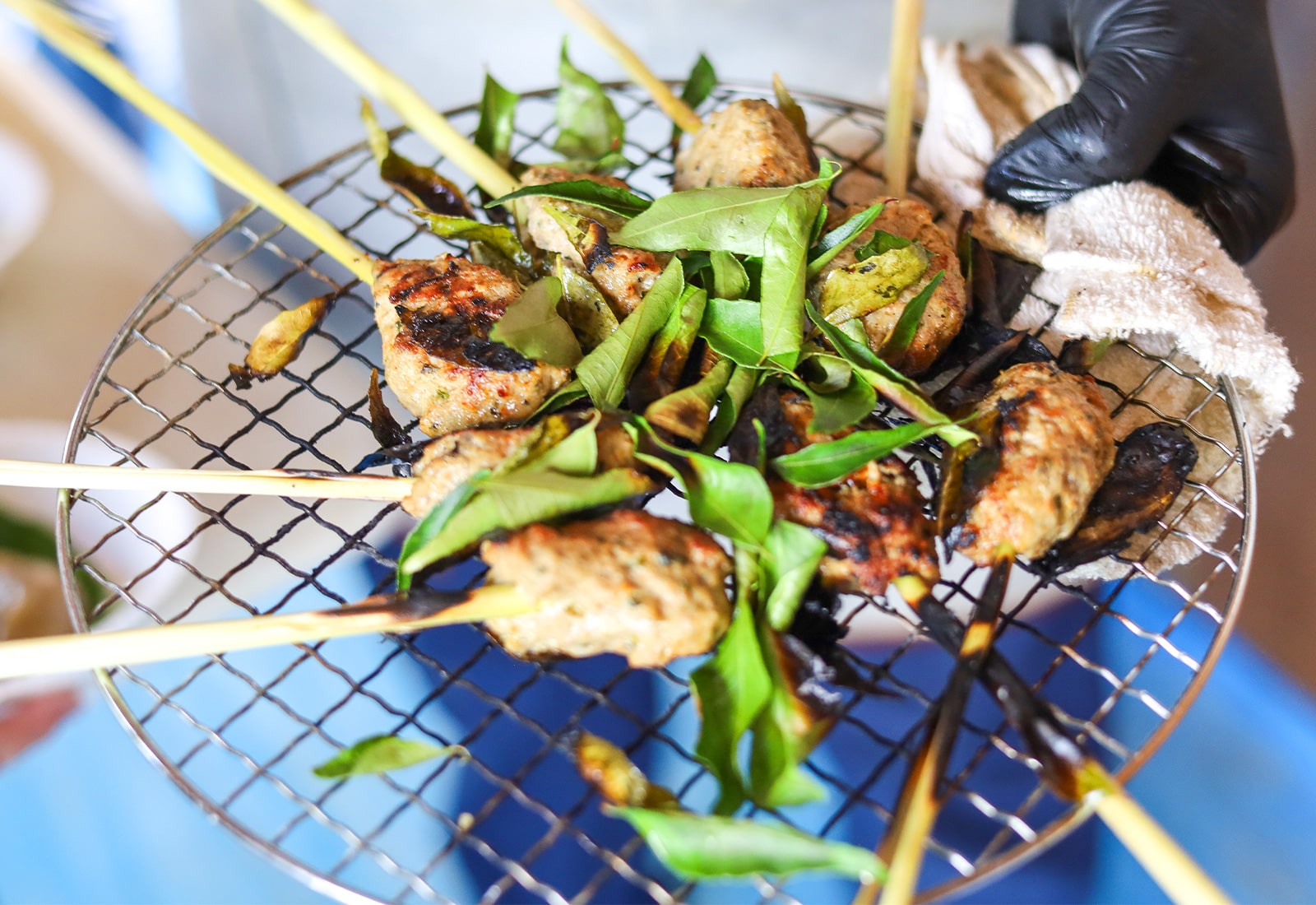 レモングラスとカレーリーフの枝と一緒に香りづけされた炭で焼かれた料理からは、香ばしく爽やかな香りがふわりと立ちのぼり、あたり一面に広がっていました。また、レモングラスをつくねの串に用いることで、香りからすでに“美味しさ”が始まっているようで、食欲がそそられる体験となりました。