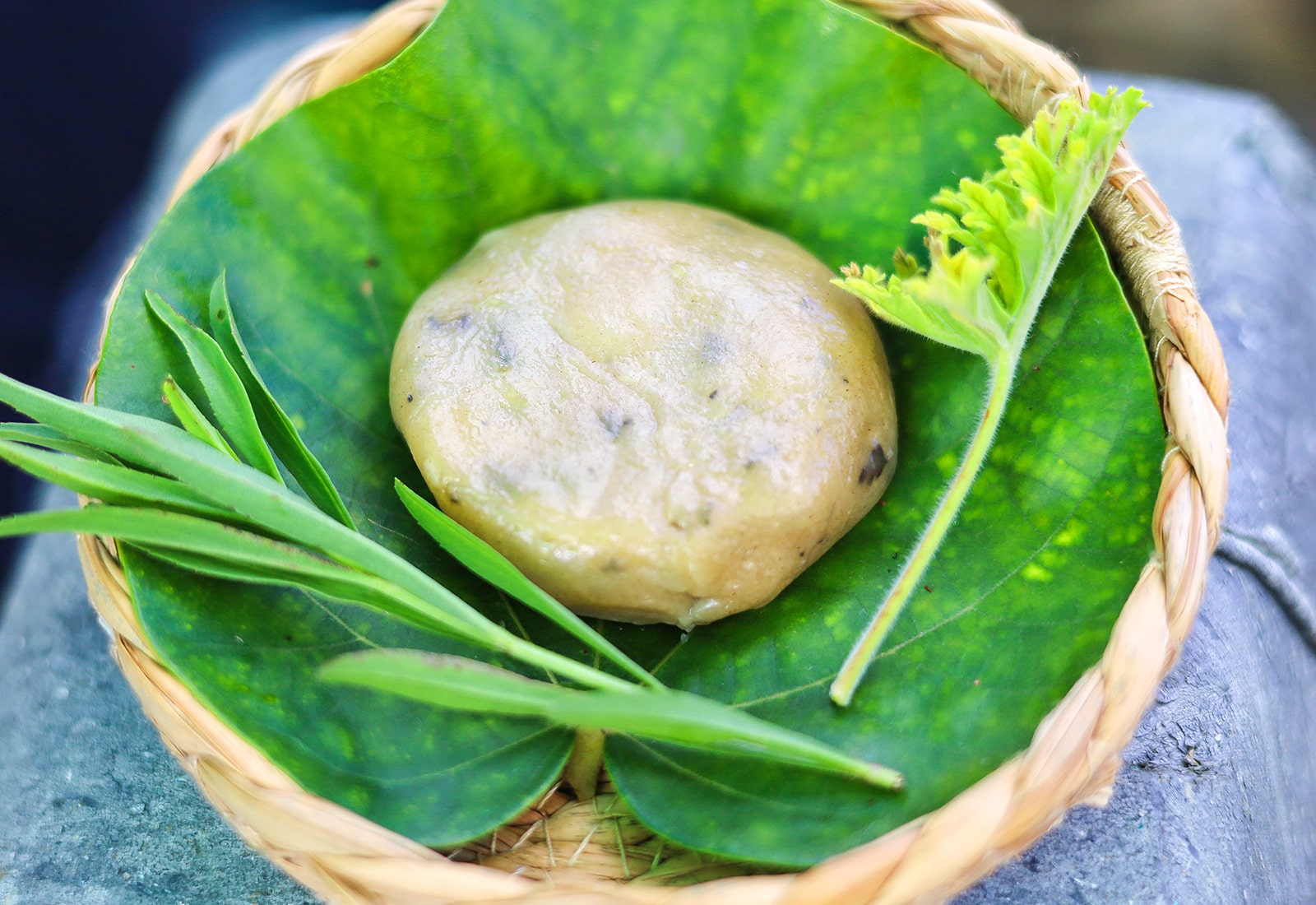 ファルス(具):キビまる豚、からし菜、ニラ、ニガナ、悦子さんのバナナ、首里味噌ウコン(玉那覇味噌をベースにウコンを混ぜて作成)、ラベンダー※おやき生地:小麦(アヤヒカリ)。もちもちとした食感を生かしておやきに使用。※ラベンダーの香りは、角谷氏の長野修業時代の思い出。その記憶に着想を得て、長野名物おやきをベースに考案。