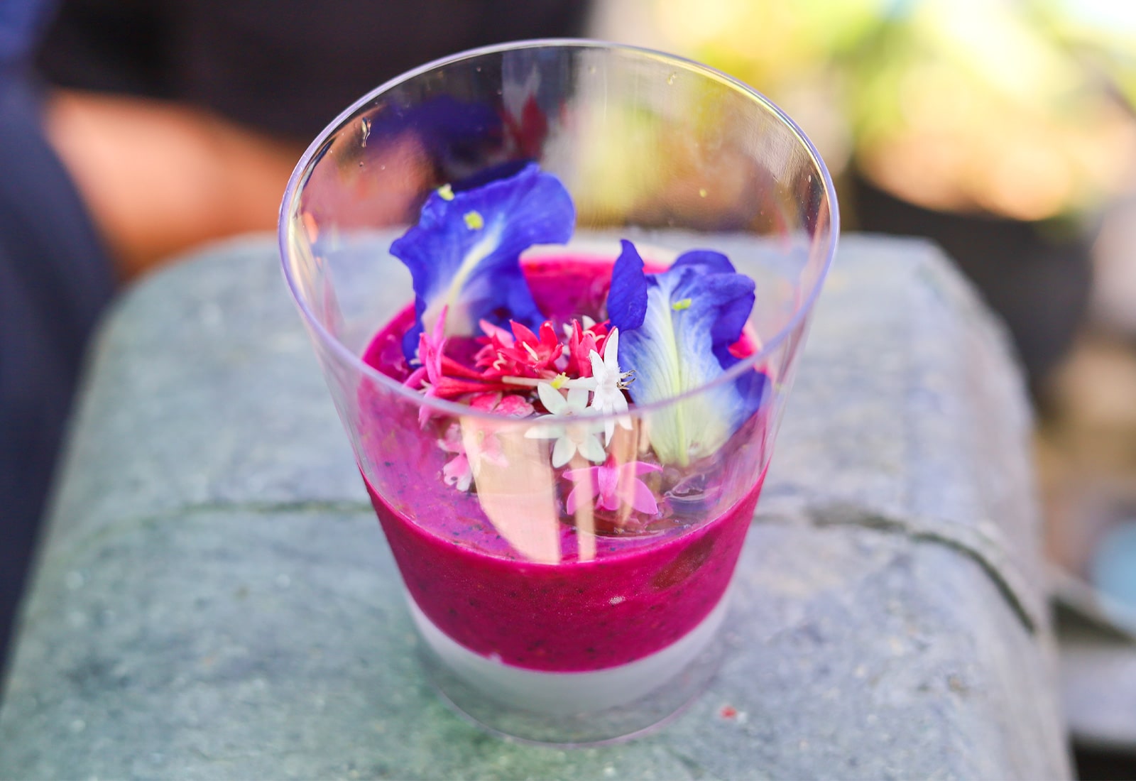・凍らせた赤ドラゴンフルーツ・白ドラゴンフルーツ(フレッシュ)・悦子さんのバナナ(フレッシュ)・シークヮーサー・和花の畑ハーブティー※上記をミキサーにかけ、器へ移し、ハーブティーのお花ジュレと飾り花を散らして完成。