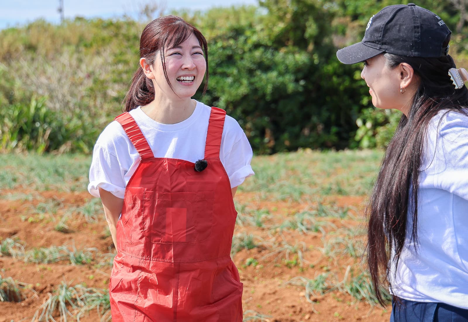沖縄本島から久米島へ嫁いで10年。2年目の春、旦那様の“休日農業”を手伝ううちに本格的に向き合いたくなり、ついにはご自身の生業にされたという平良百合子さん(写真左)。