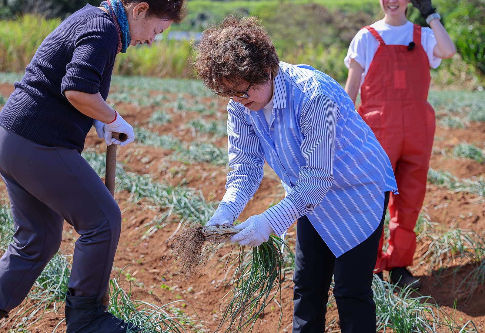 百合子さんのお話に、参加者からは次々と質問が飛び交います。畑に向き合うまなざし、土地とともに生きる覚悟。その言葉に触れたあと、いよいよ収穫体験へ。土に触れる時間が、また新たな学びを運んでくれました。