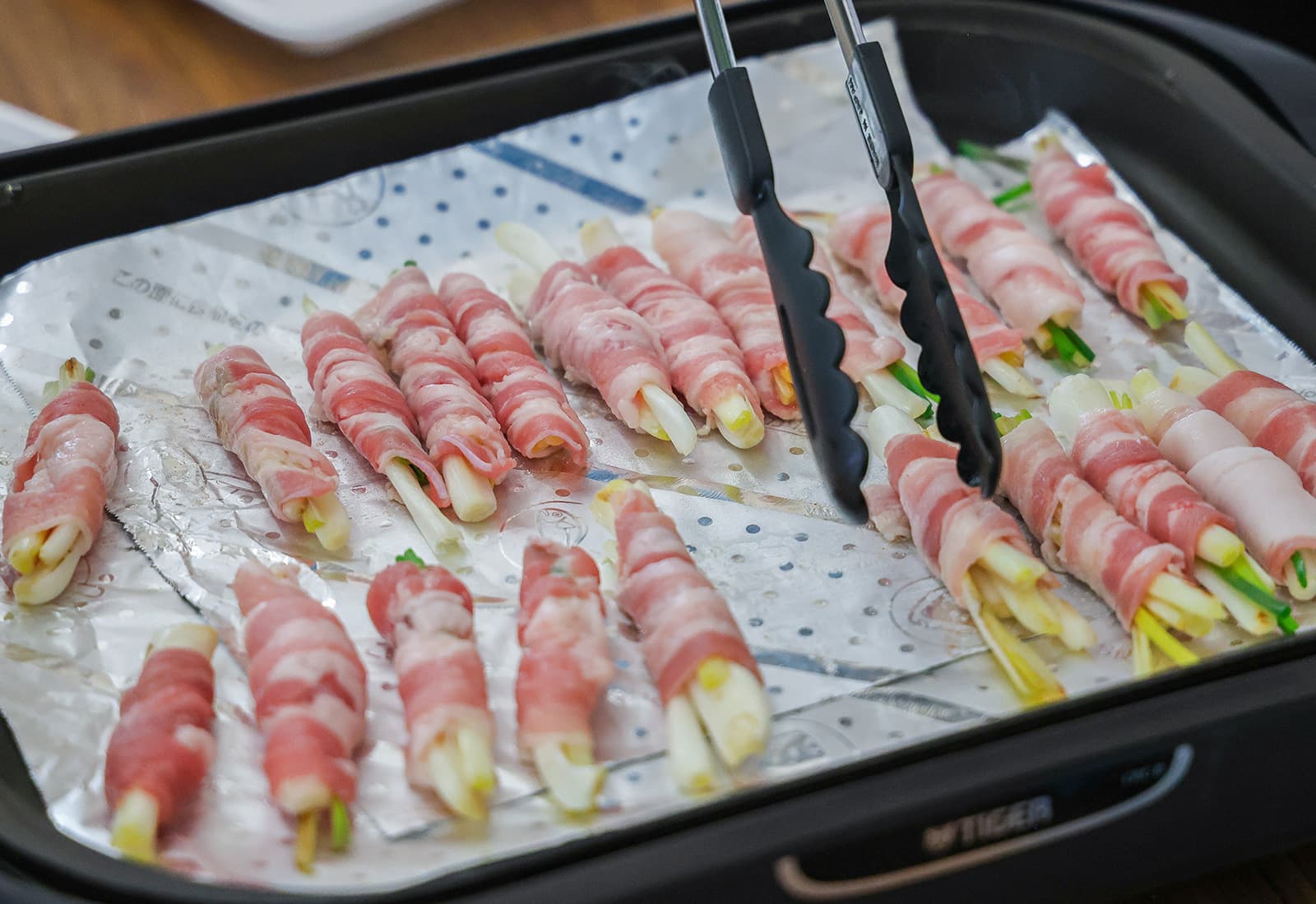 むいた島らっきょうを先に軽く炙ると風味が出ます。炙った後、豚バラを巻きつけ、また焼きます。