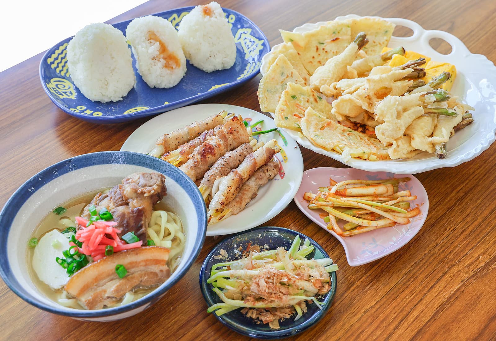 かつお節をのせた島らっきょうの塩漬け(手前)、島らっきょうのキムチ漬け(右手前)、島らっきょうの天ぷら(右上)、自分で握った油みそのおにぎりを、沖縄そばとともにいただきます。