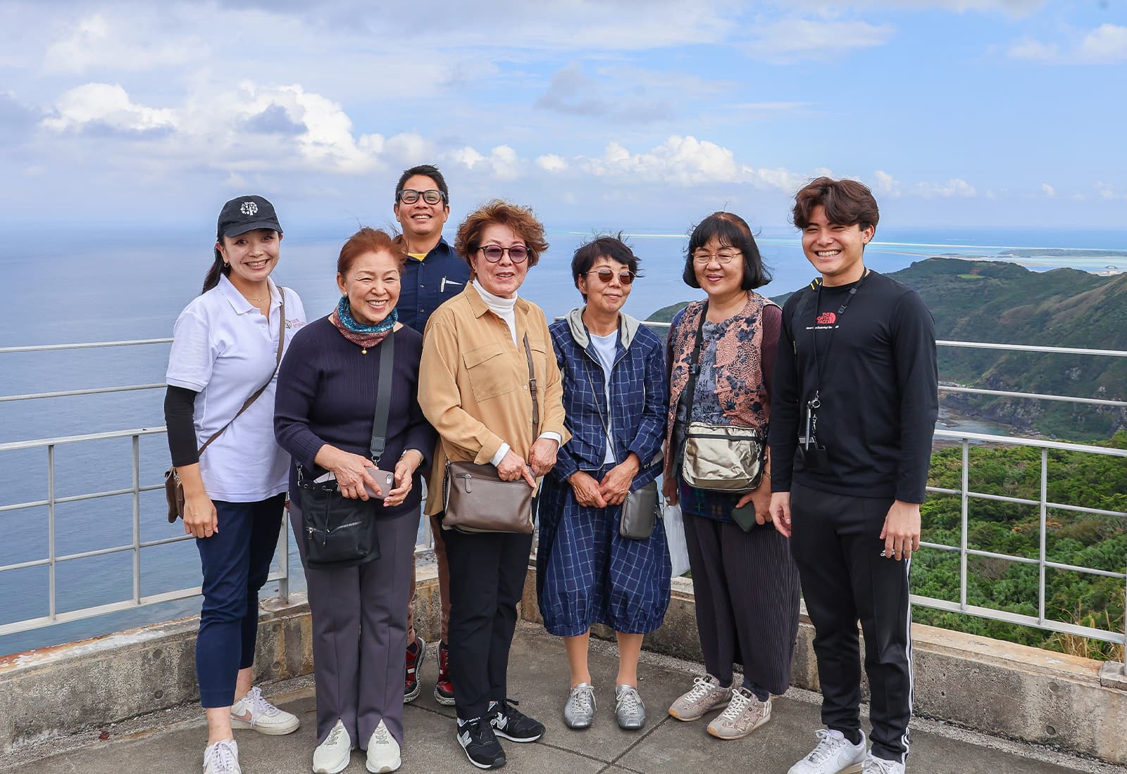 眼下に見える車海老の養殖場(久米島は車海老の養殖生産量が全国一)を眺めたあと、絶景を背景に、皆さんでパチリ。