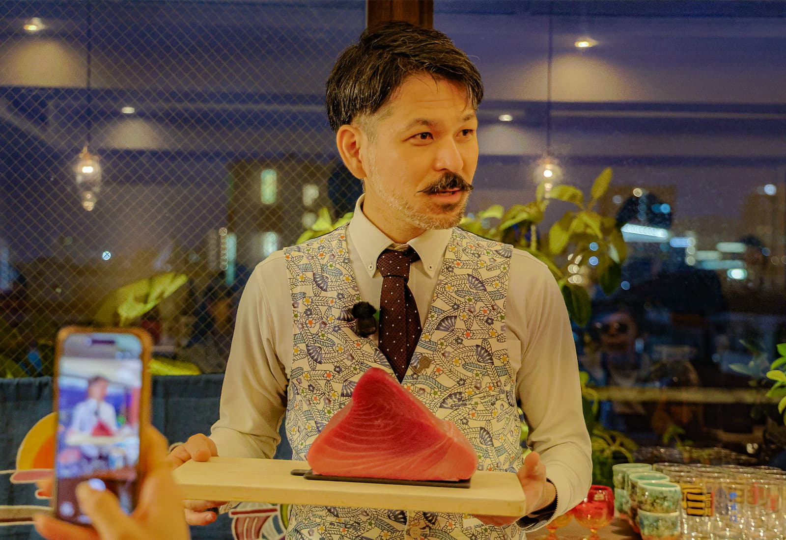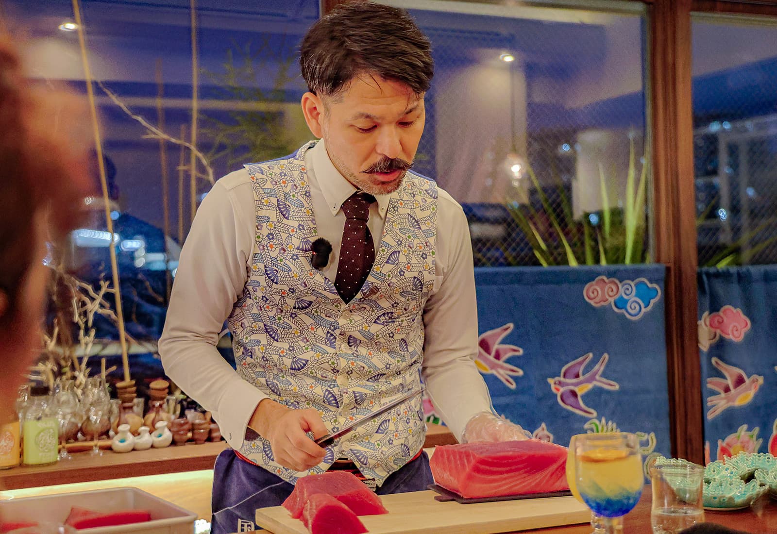 泡盛のサングリアを堪能していると、ドーン!迫力あるメバチマグロのブロックを携え、比嘉さんが現れました。わぁーっと、皆さんから歓声が起こります。