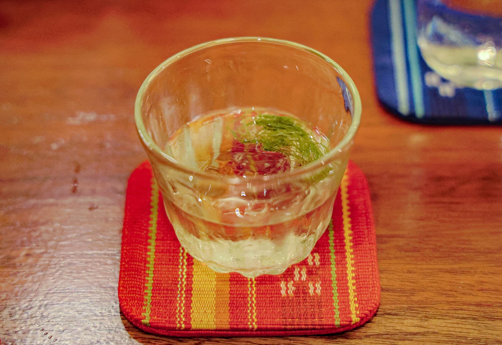 そして、このソーミンタシヤーに合わせて、ふわりと良い香りの立つグラスが置かれます。フェンネルを添えた泡盛のソーダ割りです。