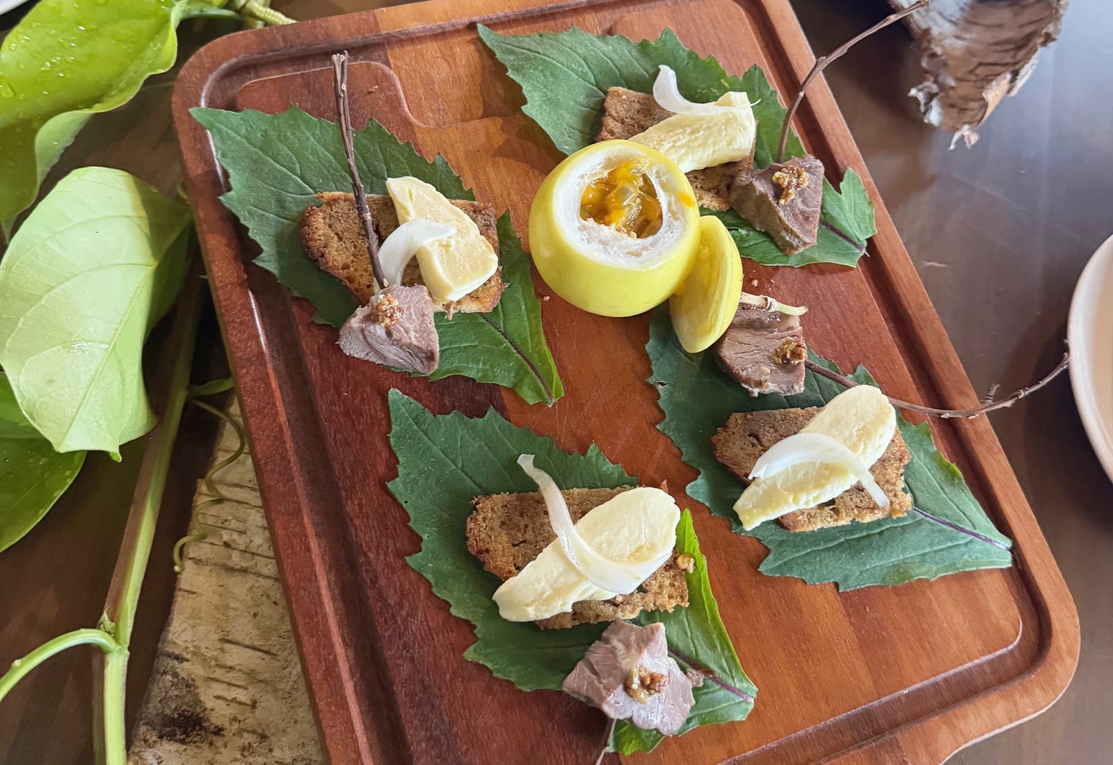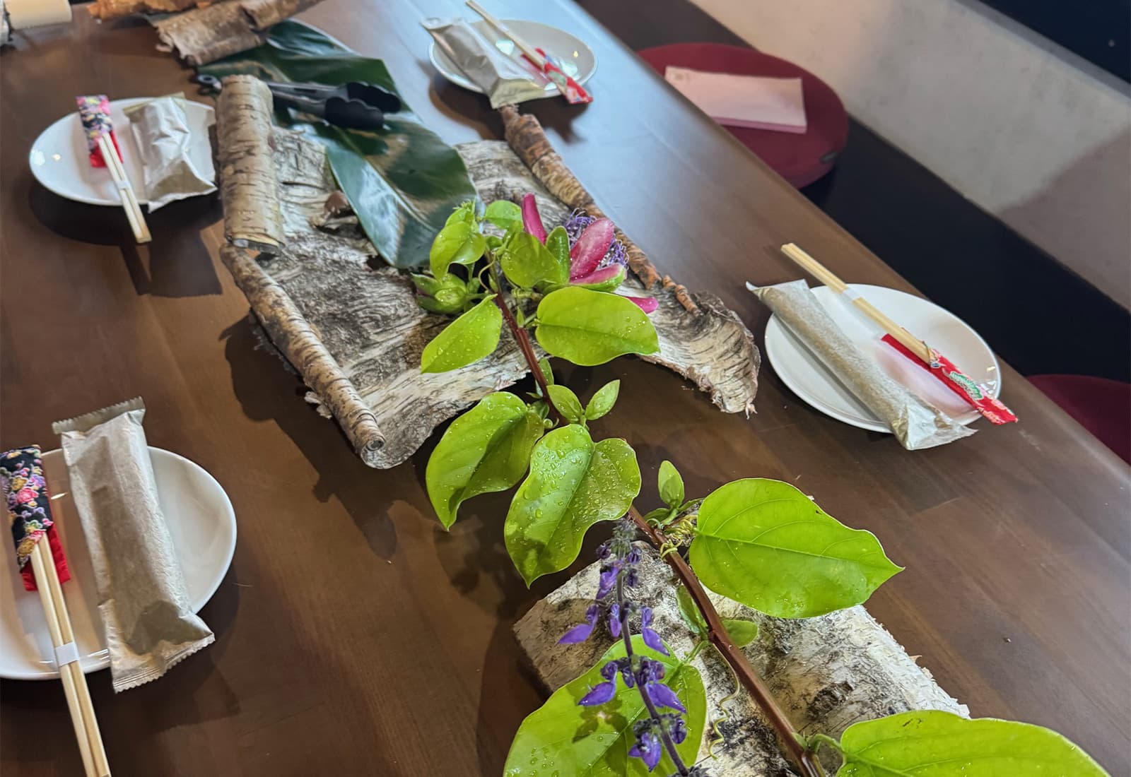 INAHO FARMの自然にある樹の皮や花を取り入れた、角谷シェフらしい素敵なテーブルプレゼンテーション。沖縄の自然がテーブルに映し出されることで、土地の風土や物語が感じられ、これから始まる食への期待が高まります。