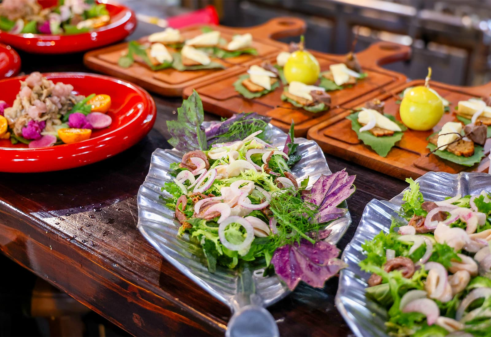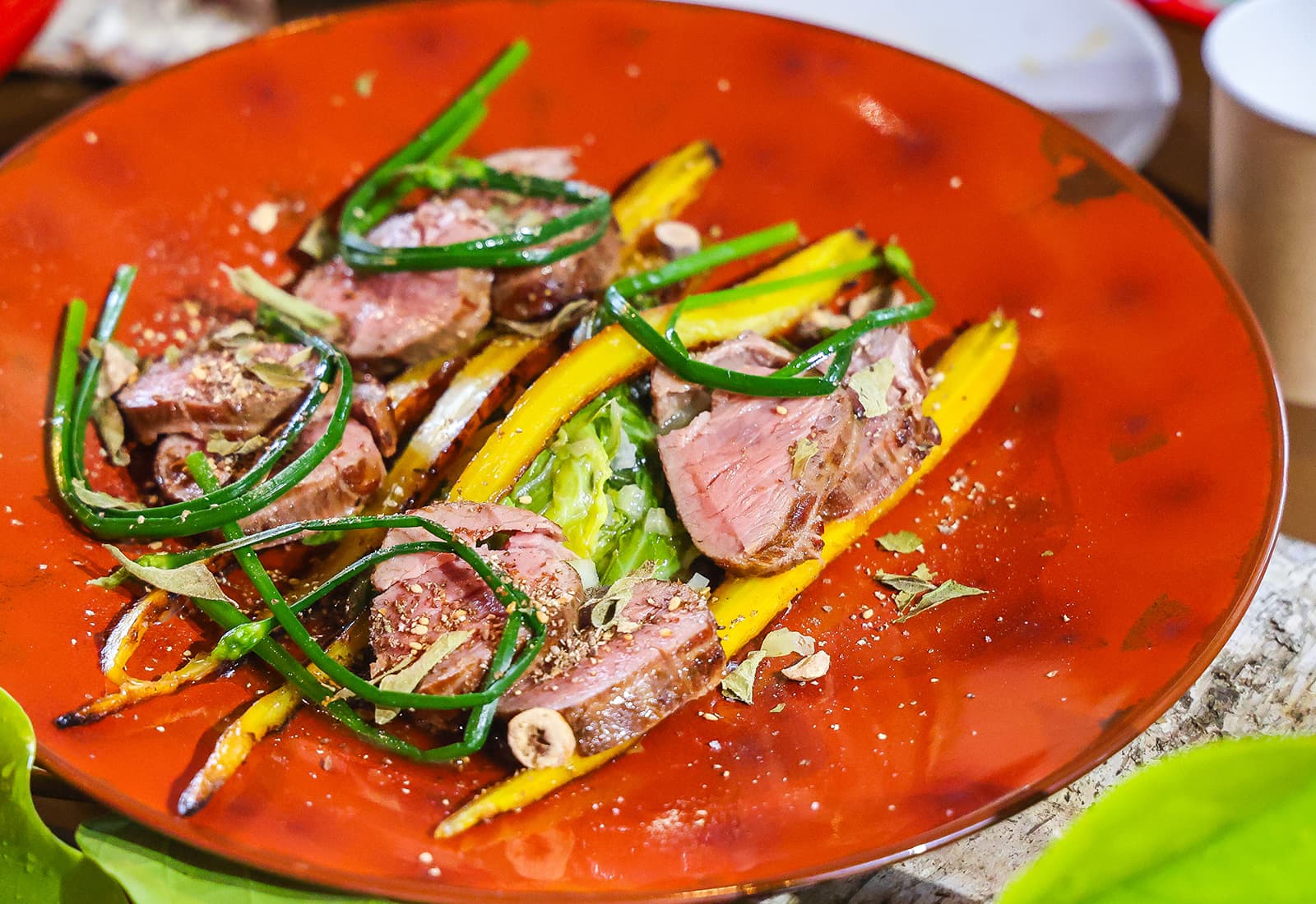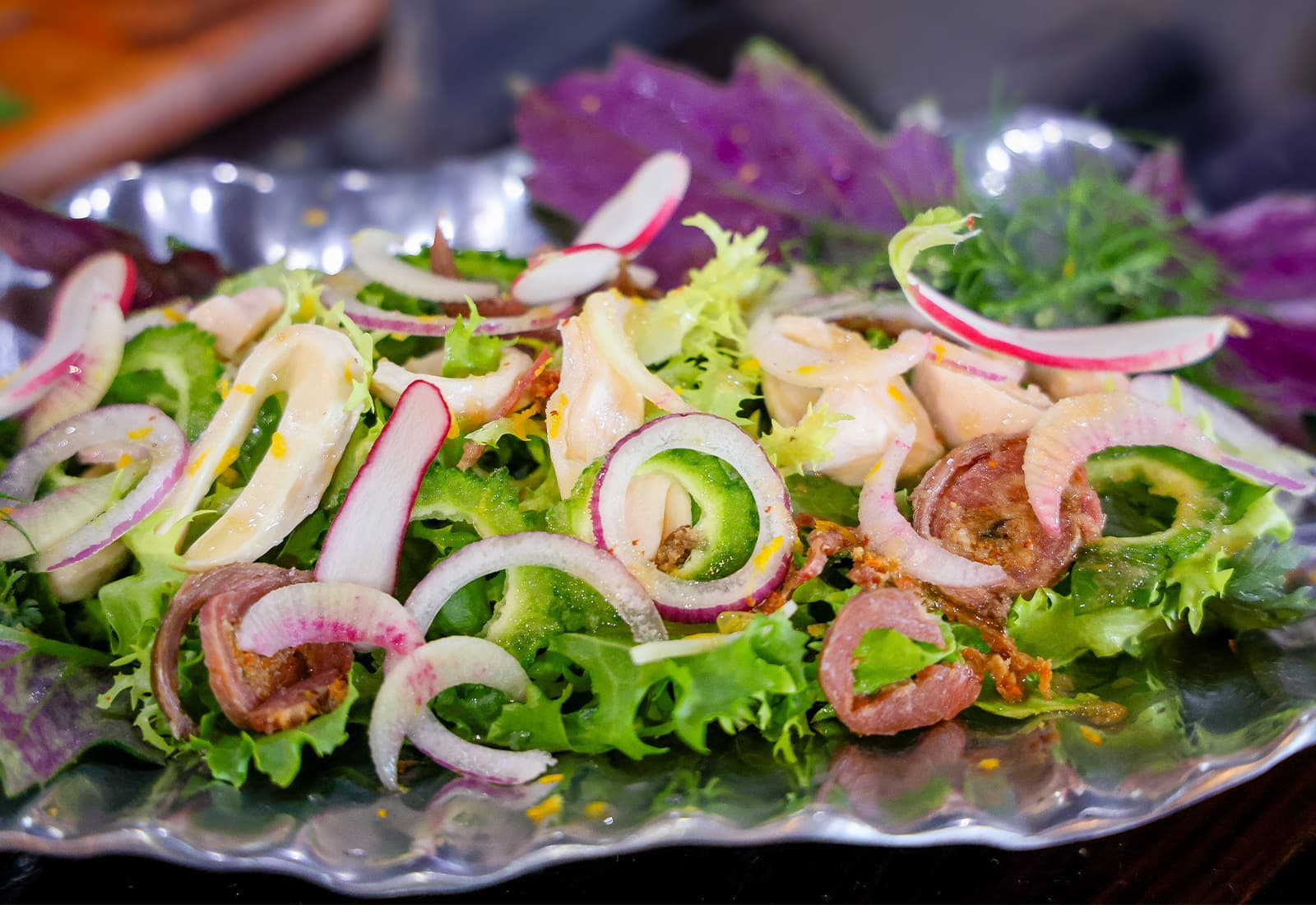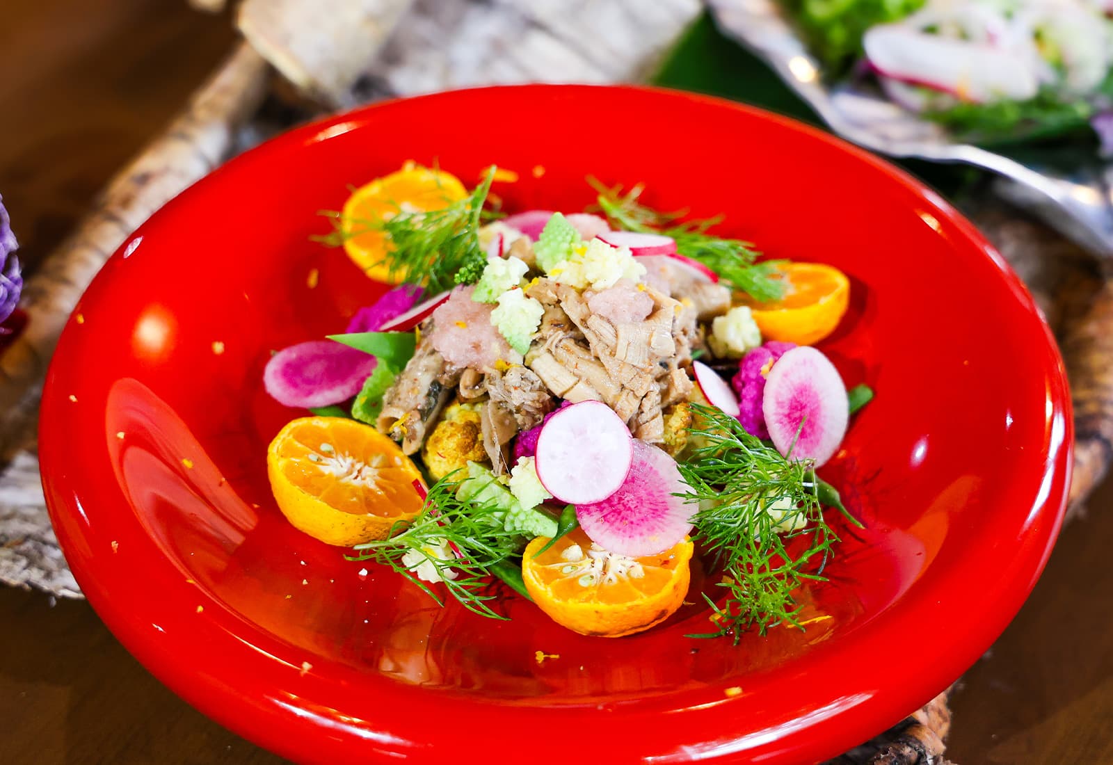 合わせるのは、山東菜、チコリ、ハンダマ、ディル、ベニバナボロギク、春菊といった香り豊かな葉野菜。さらに、二十日大根、ゴーヤ、紫オニオン、紅芯大根のスライスを重ね、彩りと食感のアクセントに。