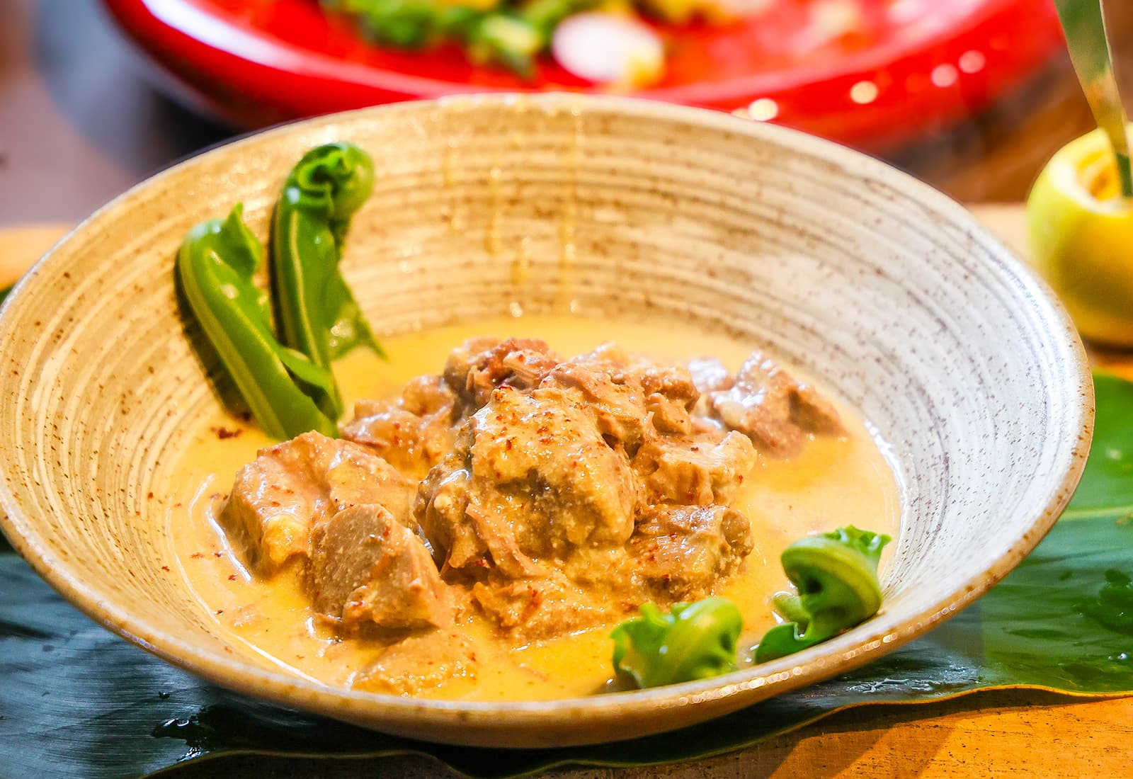仔牛の頬肉を、香味野菜とハーブとともにポトフのようにやわらかく炊き上げ、仕上げに、沖縄のシナモンとも呼ばれるカラキの枝を串に見立てて刺し、さっと炙って香りをまとわせています。ほのかに立ち上るスパイスの余韻が、肉の旨味を引き立てます。