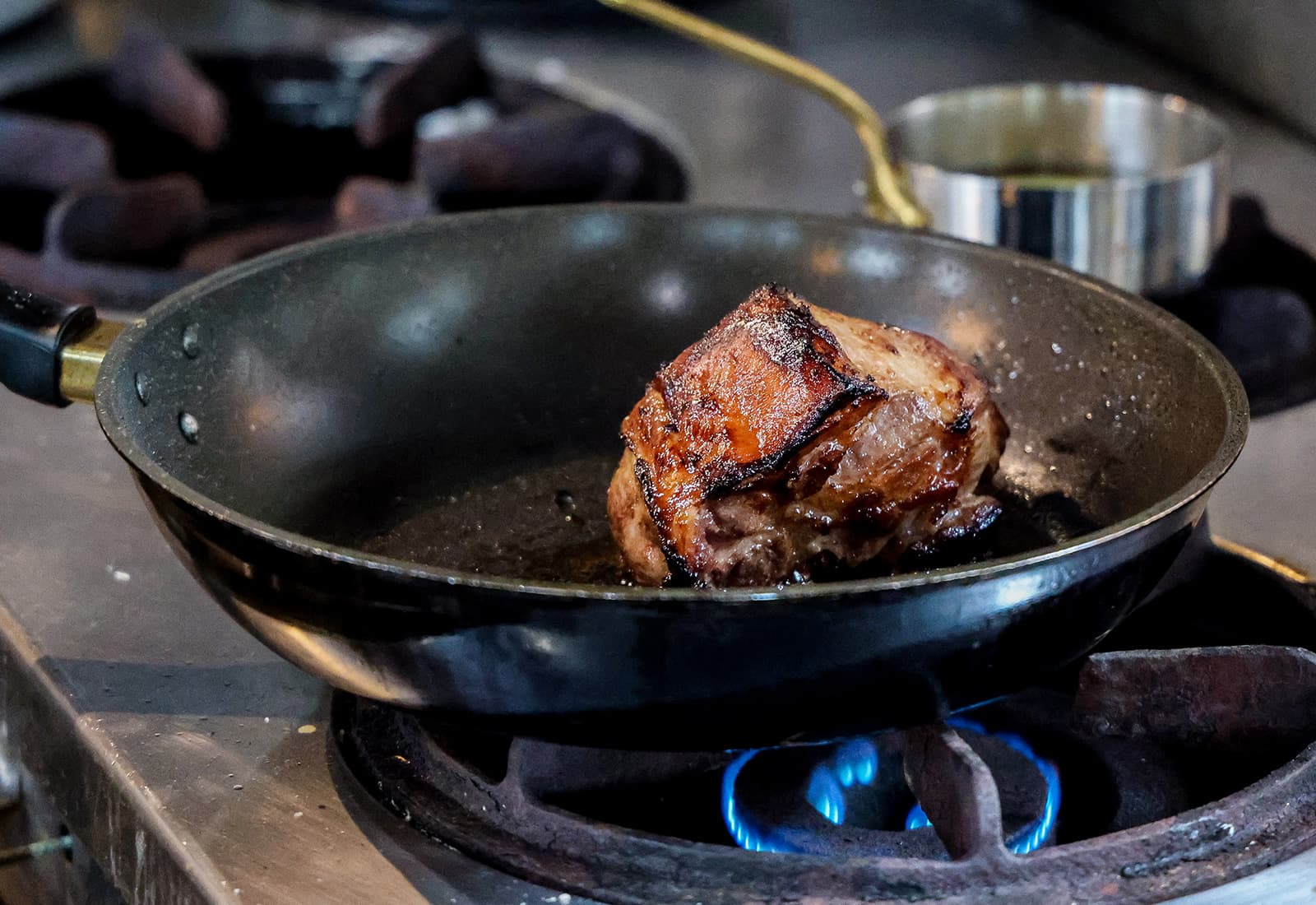 添えるのは、仔牛のエキスを凝縮したソース。スジを強火でしっかりと焼き、出てきた脂で香味野菜を炒めて香りを引き出します。そこへ水を加えて丁寧にスープを取り、さらに煮詰めたソースです。